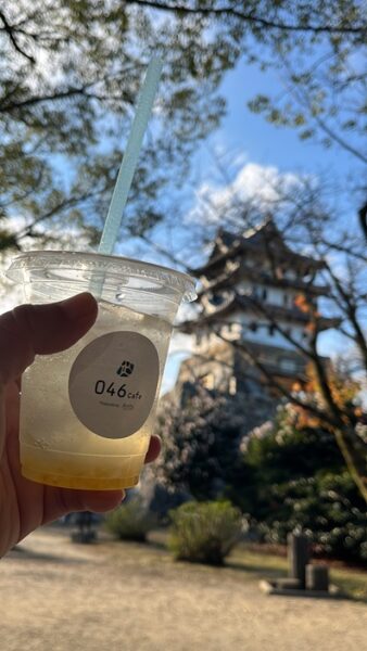天守閣のそばにカフェ、オレンジの皮を食べるソーダってのを頂いてみました。